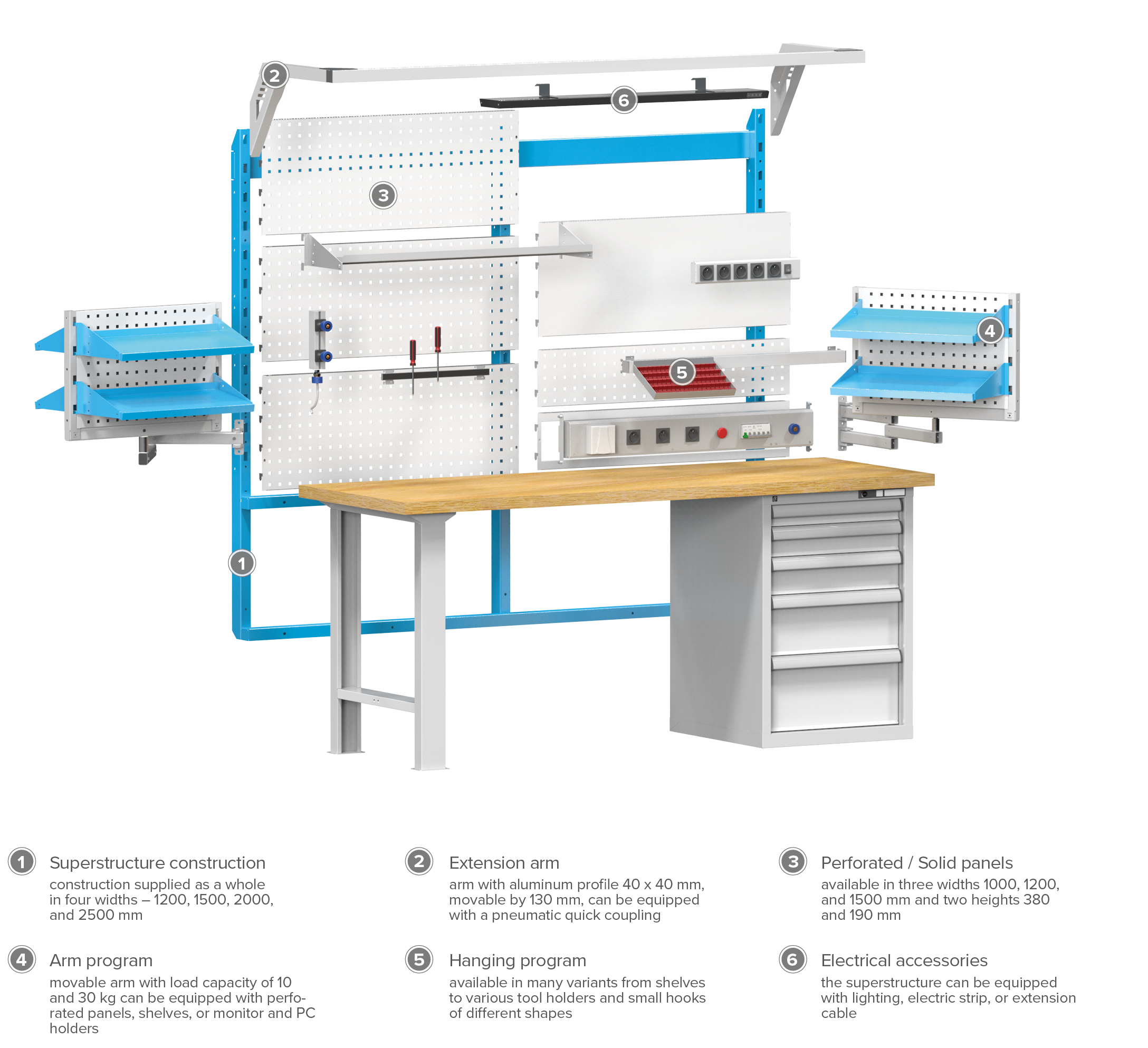 You simply attach an arm (in the width of the riser) to the structure, which you can use to attach a lighting fixture, a pneumatic quick coupling or a trolley. The arm is sliding by 130 mm and its profiles are made of anodized aluminium.
