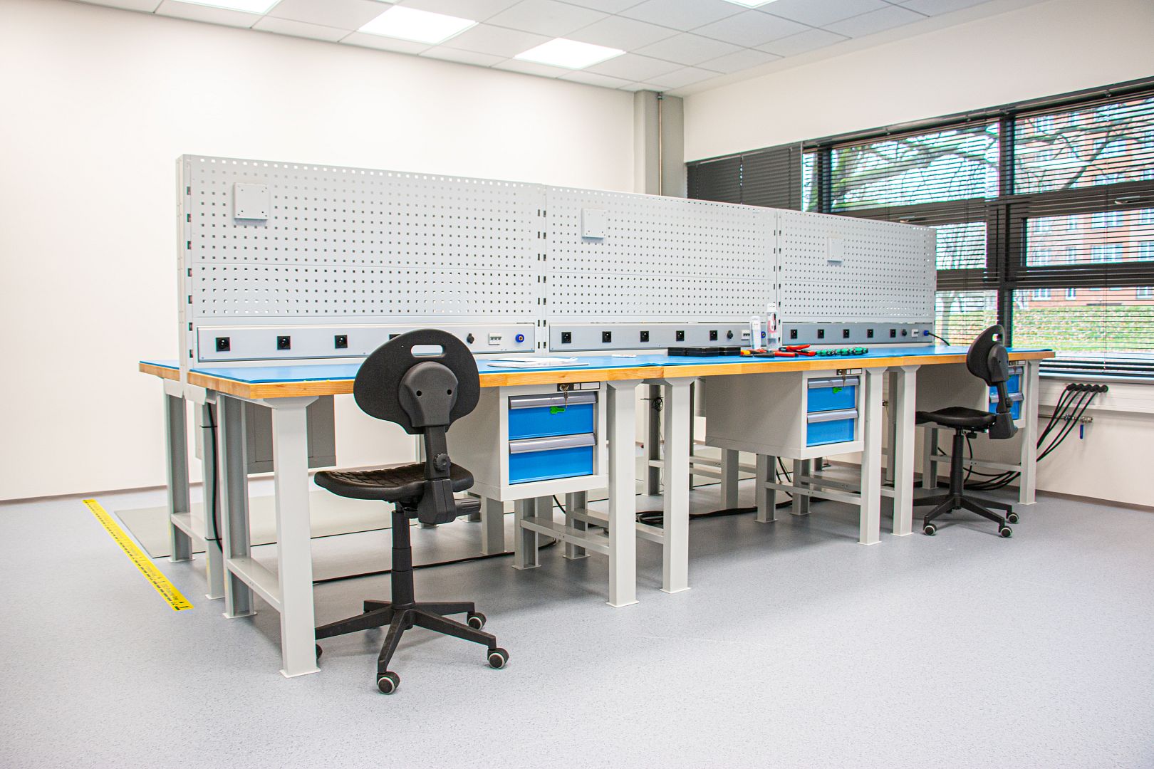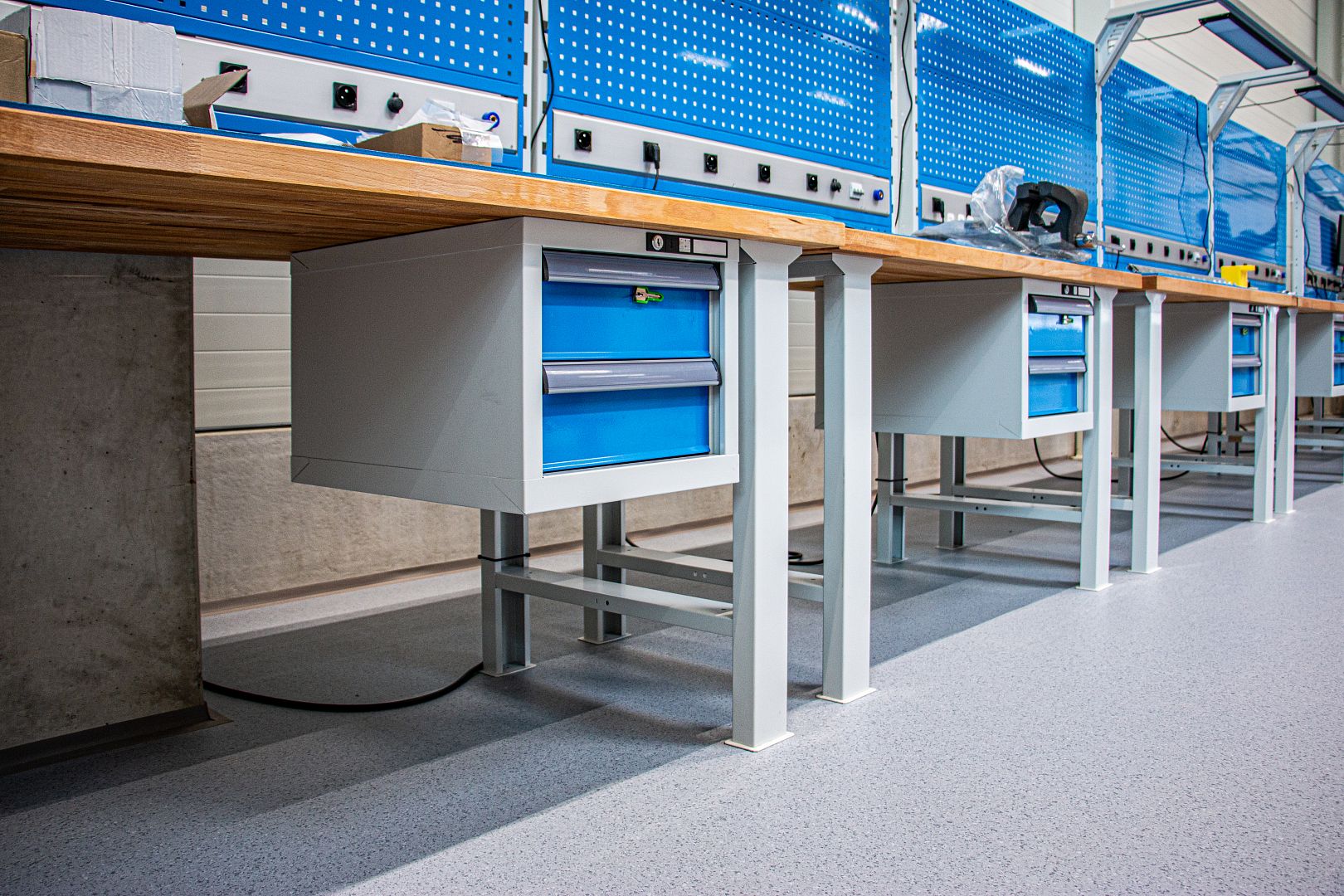 The table legs can be fitted with wheels or electrical equipment. The workspace can be greatly expanded with the addition of workbench extensions and a wide range of accessories.